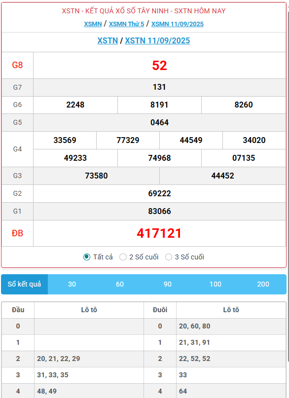Kết quả xổ số Tây Ninh ngày 11/09/2025