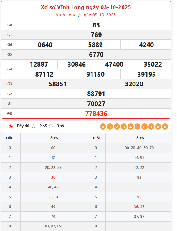 Kết quả xổ số Vĩnh Long ngày 03/10/2025