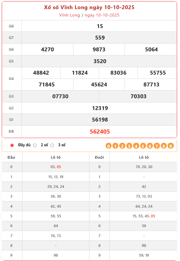 Kết quả xổ số Vĩnh Long ngày 10/10/2025