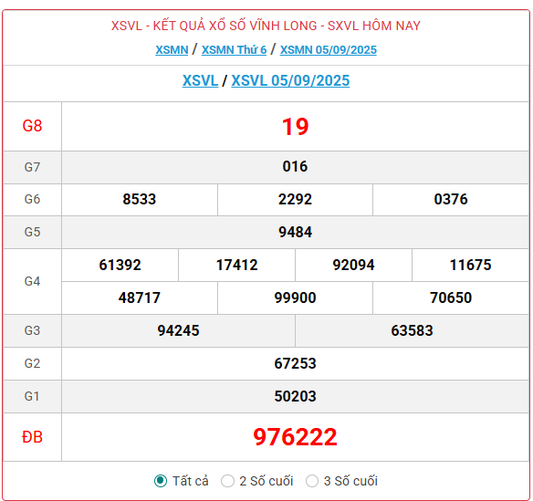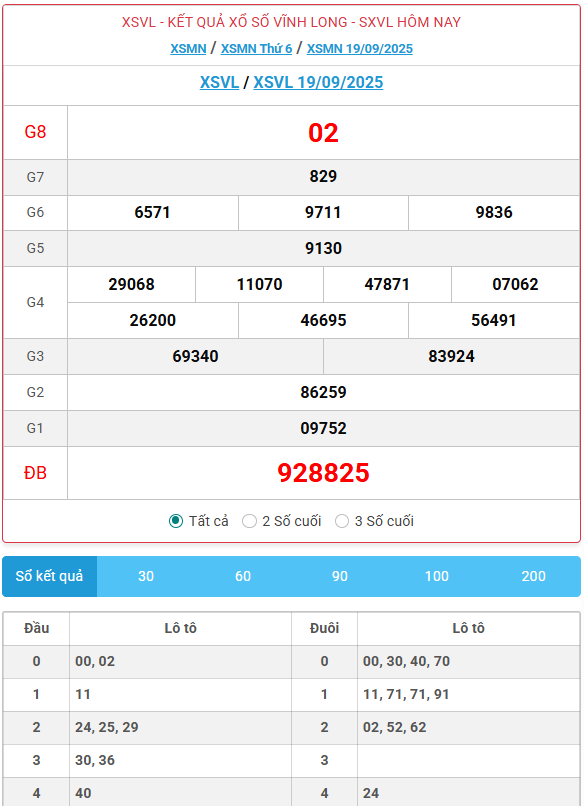 Kết quả xổ số Vĩnh Long ngày 19/09/2025