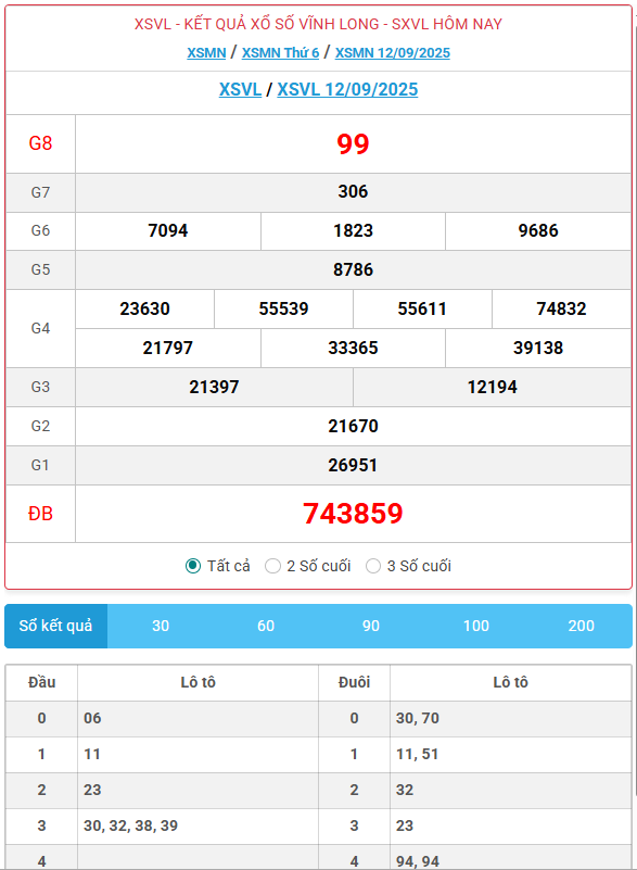 Kết quả xổ số Vĩnh Long ngày 12/09/2025