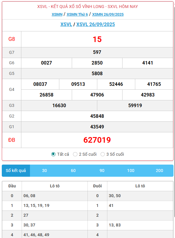 Kết quả xổ số Vĩnh Long ngày 26/09/2025